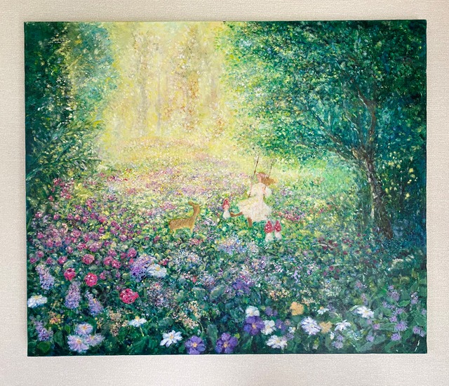 花の間を流れてゆく小川 流れる音をきいていた 清らかな水が身体のまん中を流れていくようで、 私はただのわたしになった キャンバスにアクリル絵の具、油絵の具 F8号 (38.8cm× 45.5cm× 1.8cm)