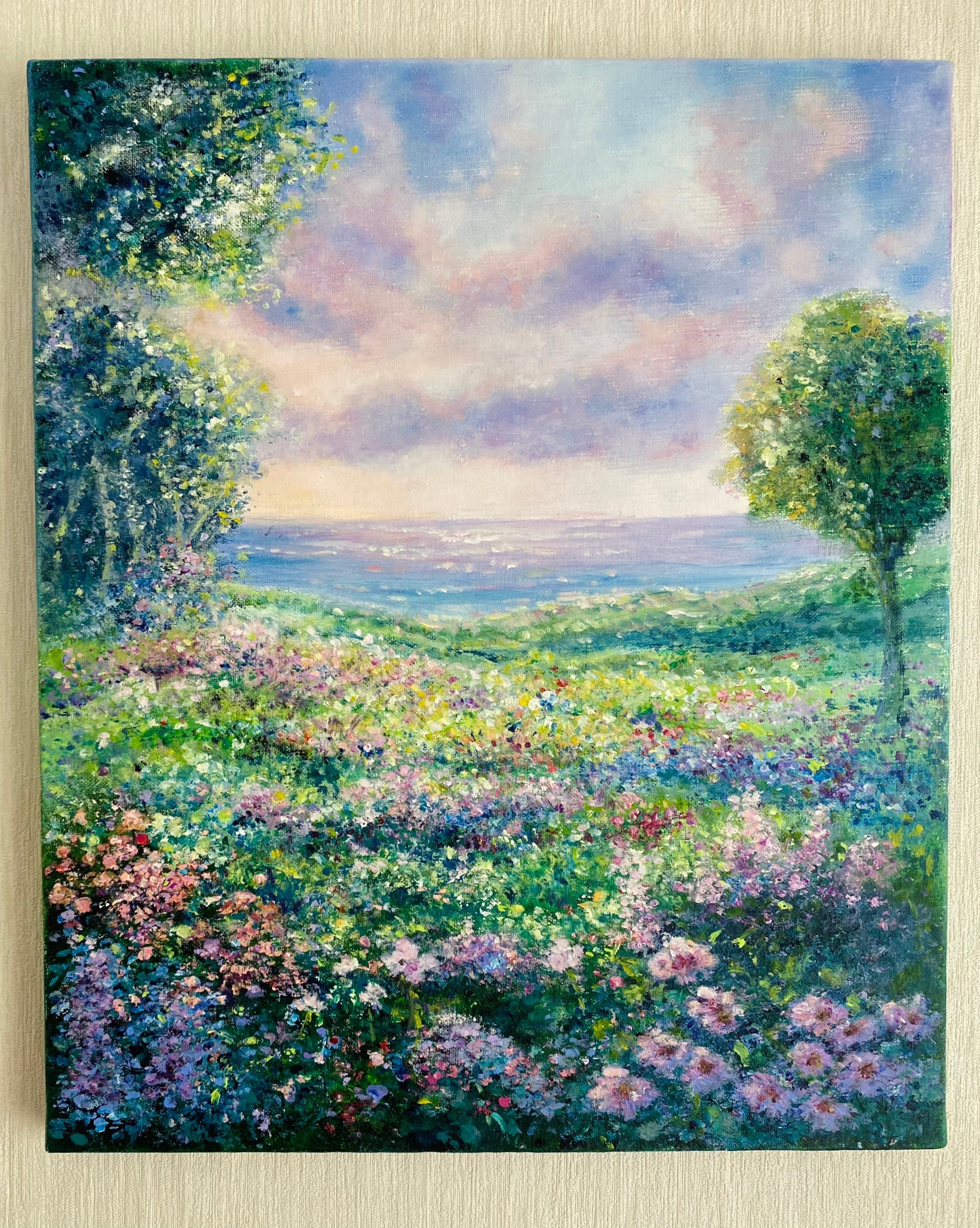 朝の優しい光に照らされ、花をなでる風が見えるよう。